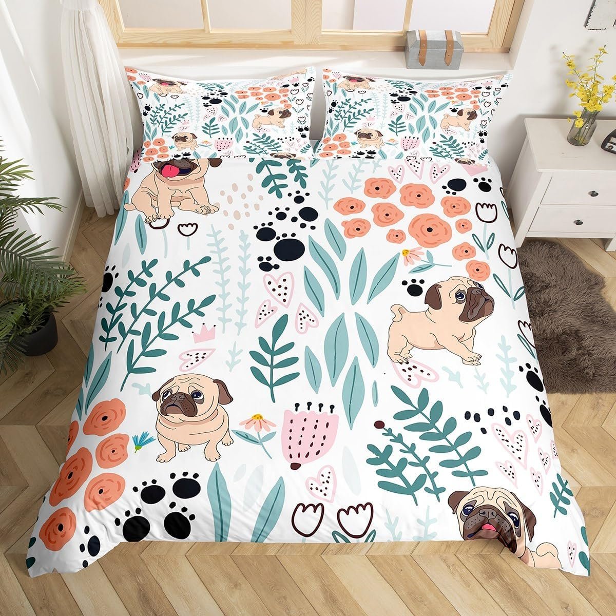 Write an article about Erosebridal Kawaii Dog Bedding Set,Cartoon Pug Dog Duvet Cover Twin,Cute Love Heart Leaf Flower Comforter Cover for Kids Girls Boys,Paw Print Pet Animals Bed Set with 1 Pillow Case in English
