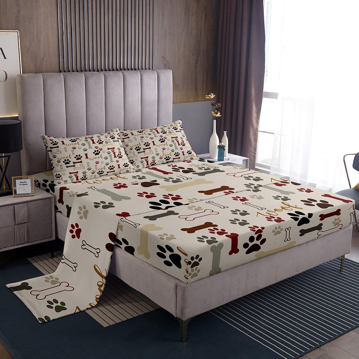 Write an article about Homewish Dog Paw Print Sheet Set Queen,Bone Pattern Bedding Set for Kids Teens Girls Boys,Pet Animal Cartoon Bed Sheet Set 4pcs with Deep Pocket Fitted Sheet + Flat Sheet + 2 Pillowcases in English